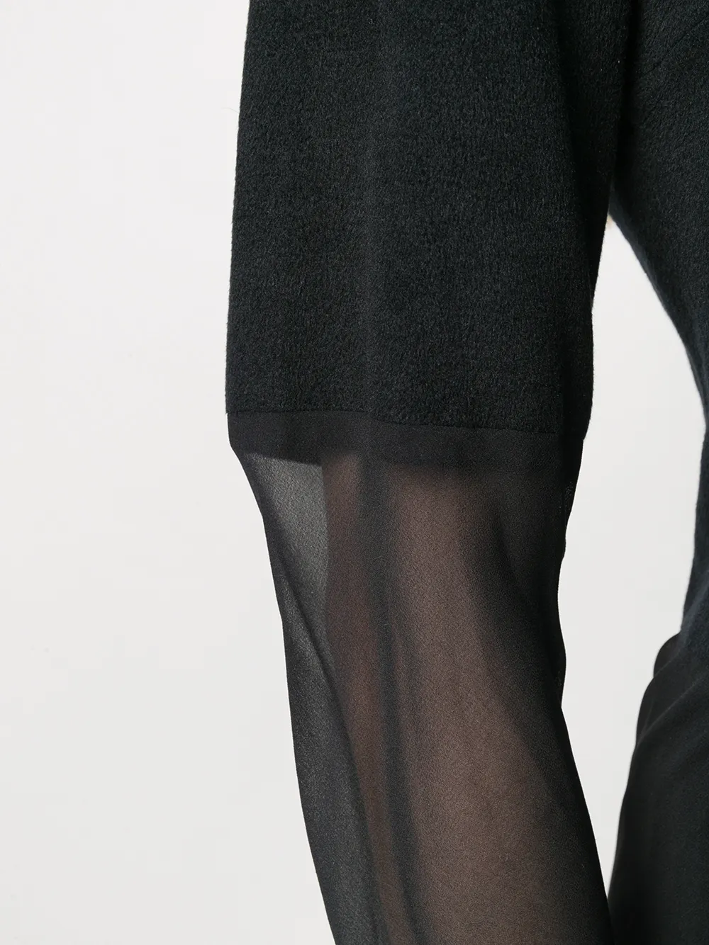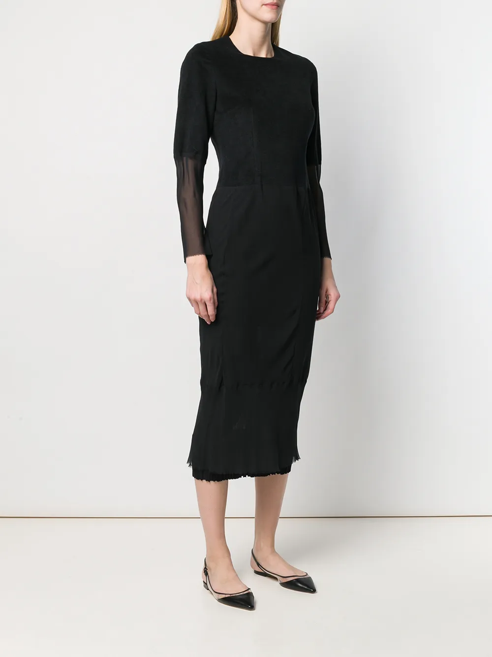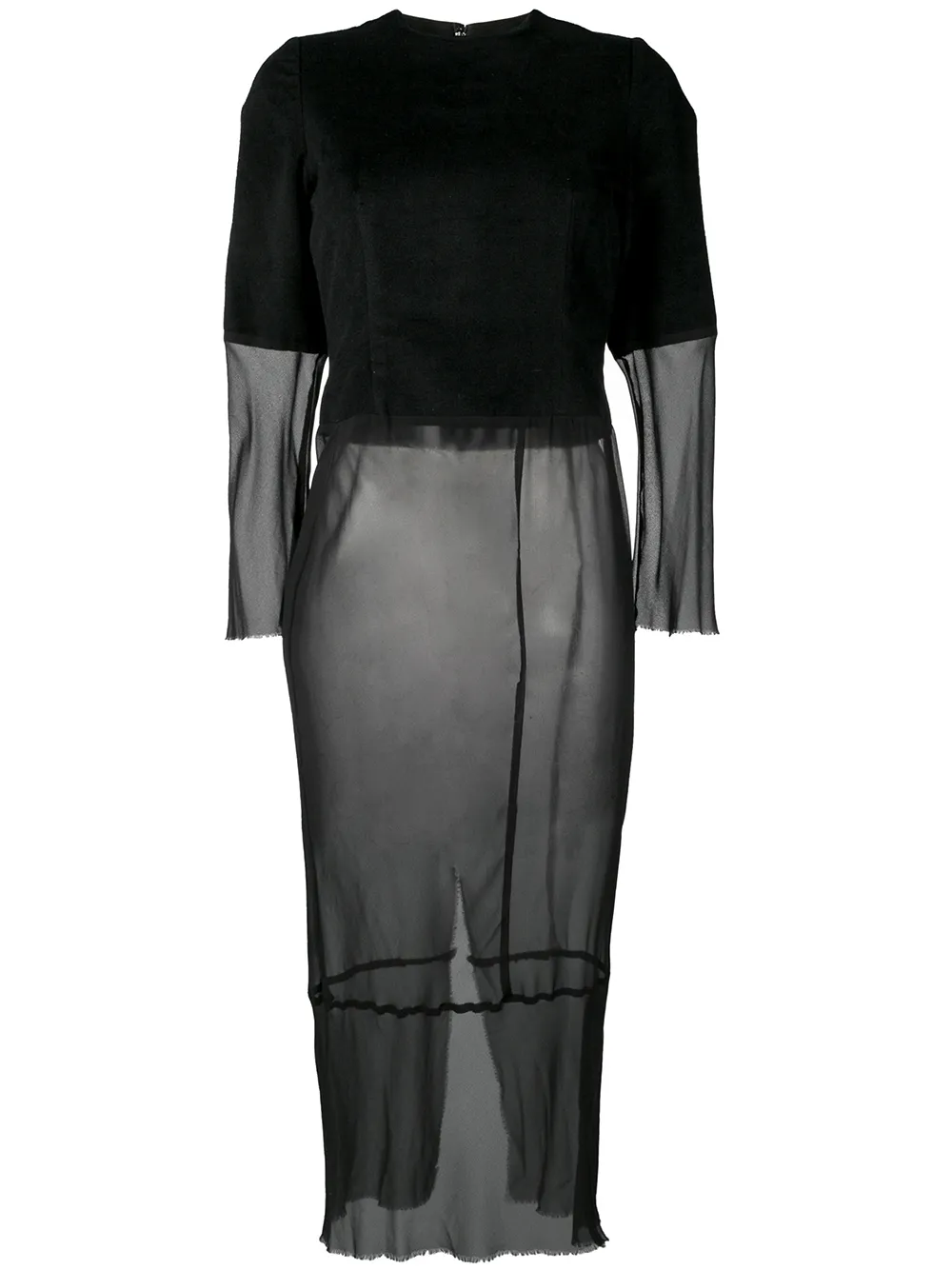 Robe à détail transparent en soie Comme Des Garçons Vintage avec encolure ronde, zip dissimulé arrière, manches longues transparentes, taille resserrée, longueur medium, design superposé et bords frangés. Couleur : noir. Veuillez noter que nos articles vintage ne sont pas neufs et qu’ils peuvent avoir de légères imperfections.