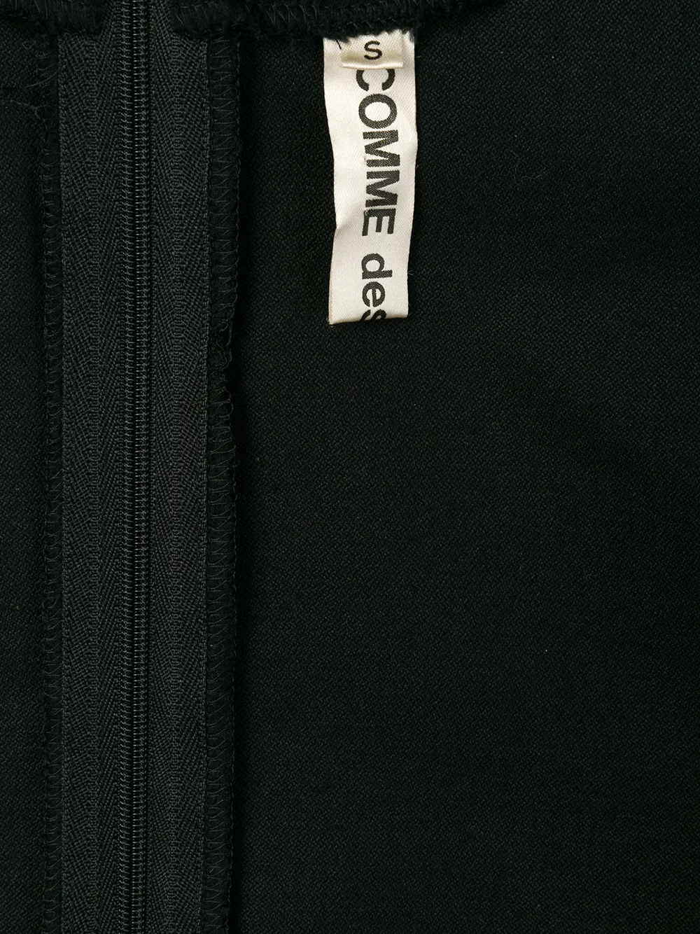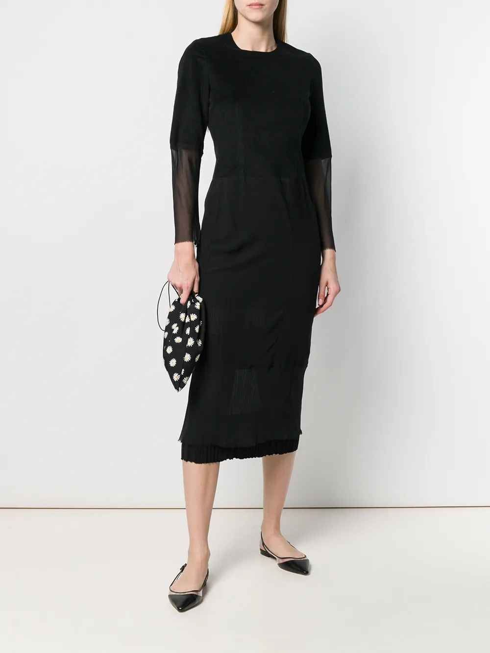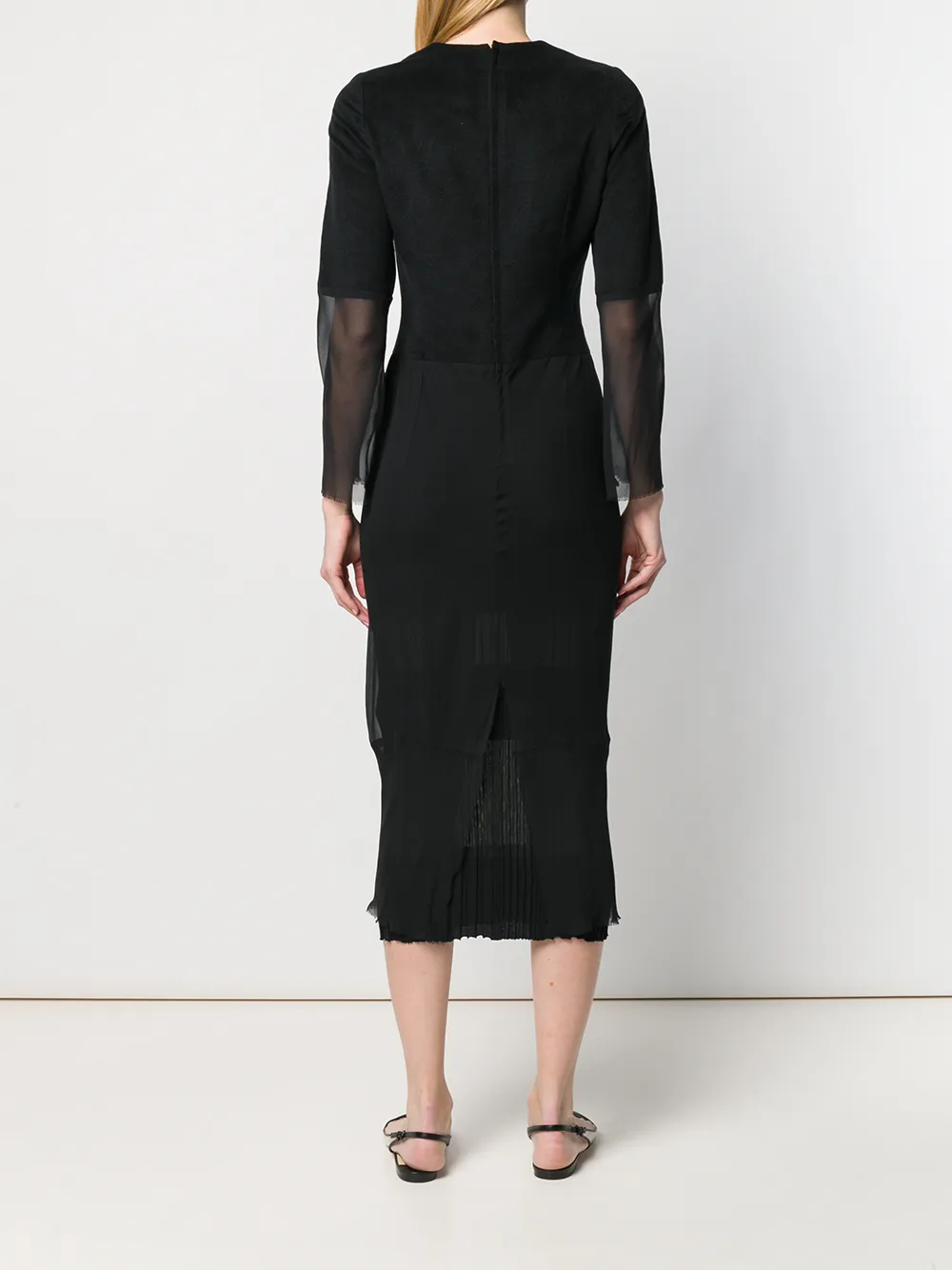 Robe à détail transparent en soie Comme Des Garçons Vintage avec encolure ronde, zip dissimulé arrière, manches longues transparentes, taille resserrée, longueur medium, design superposé et bords frangés. Couleur : noir. Veuillez noter que nos articles vintage ne sont pas neufs et qu’ils peuvent avoir de légères imperfections.