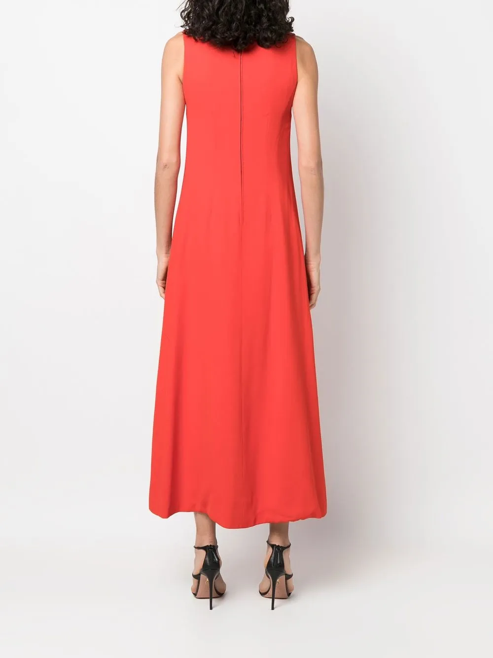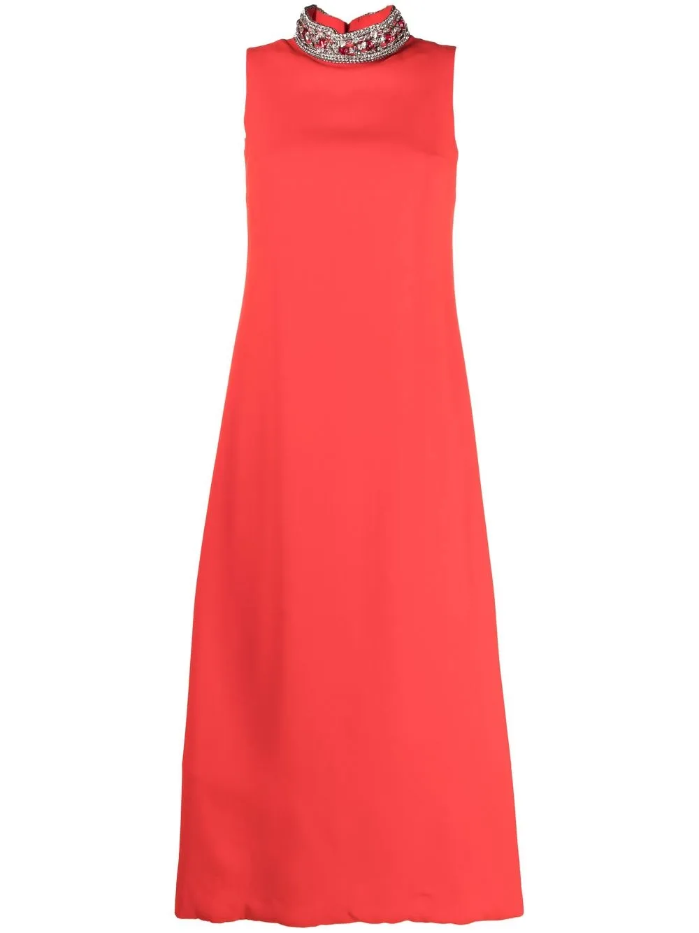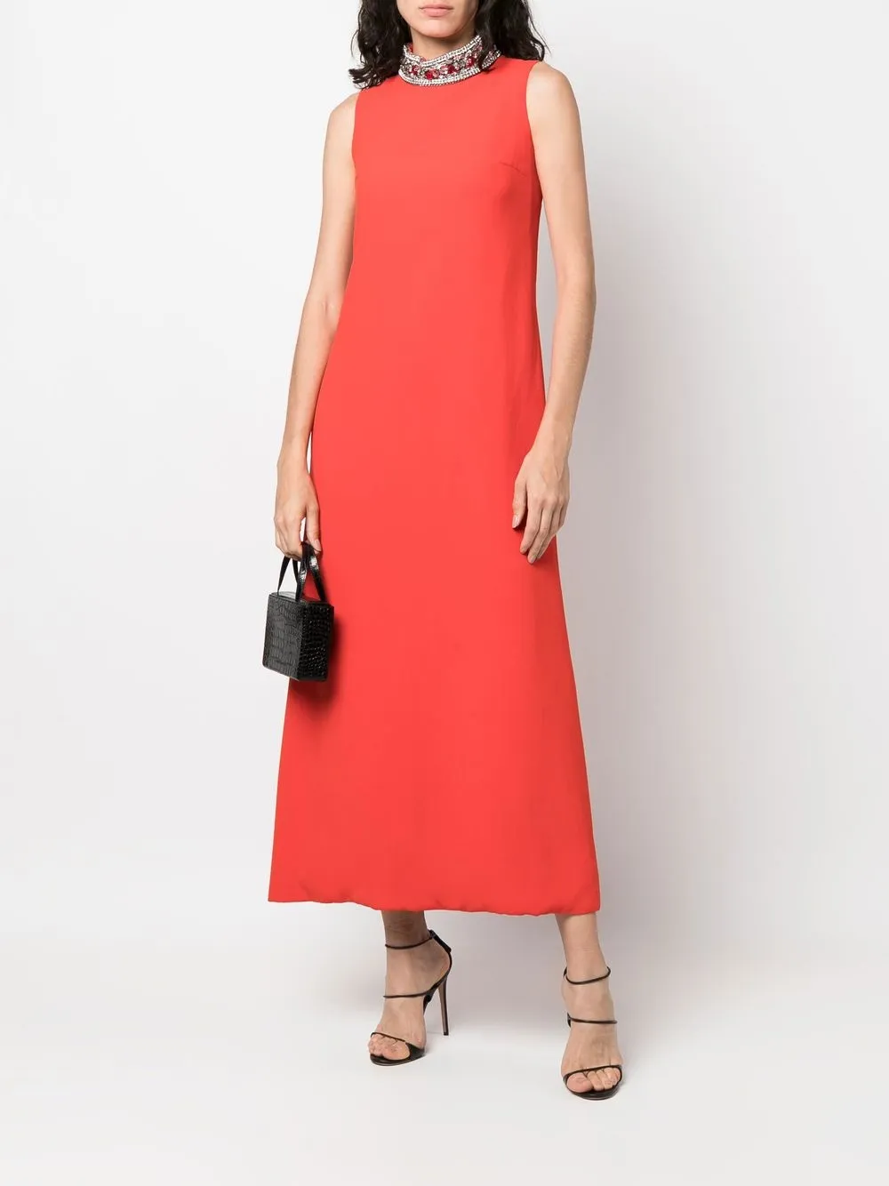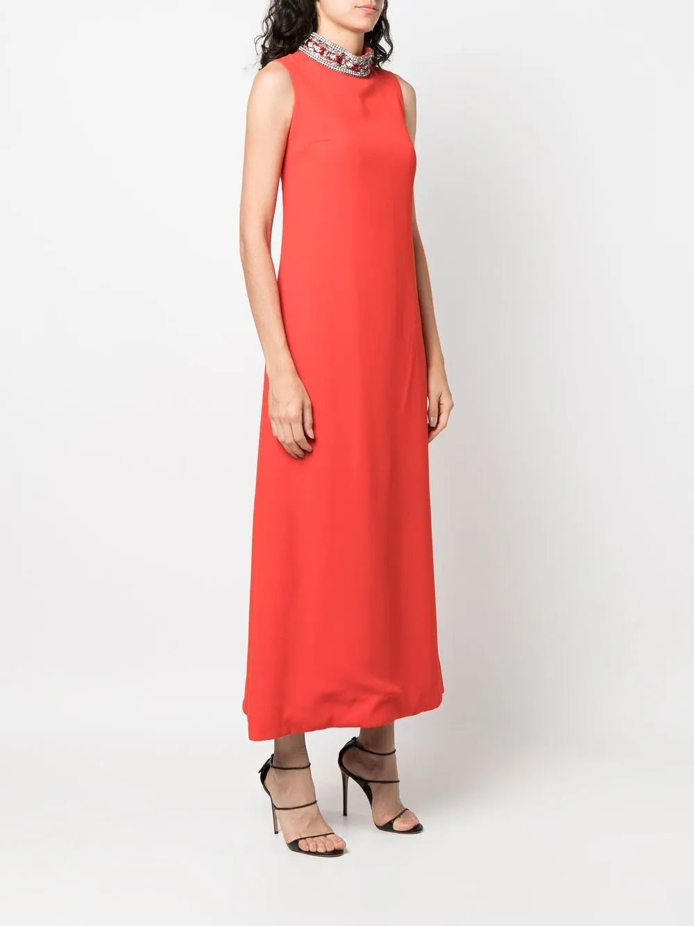 Orange, crêpe de soie, col montant, ornement en strass, fermeture zippée dissimulée à l’arrière, design sans manches, jupe trapèze, hauteur cheville, ourlet droit, sans doublure. POSITIVELY CONSCIOUS – Votre choix : produit fabriqué selon des pratiques visant à réduire l’impact environnemental. Cet article a un impact environnemental réduit car il ne nécessite pas de nouvelles ressources. Vous êtes ainsi assuré·e de faire le bon choix pour la planète.