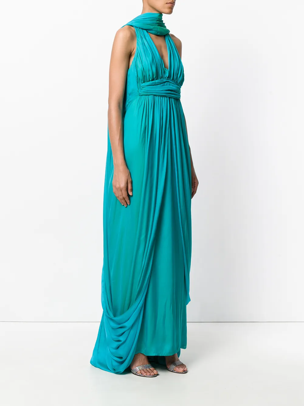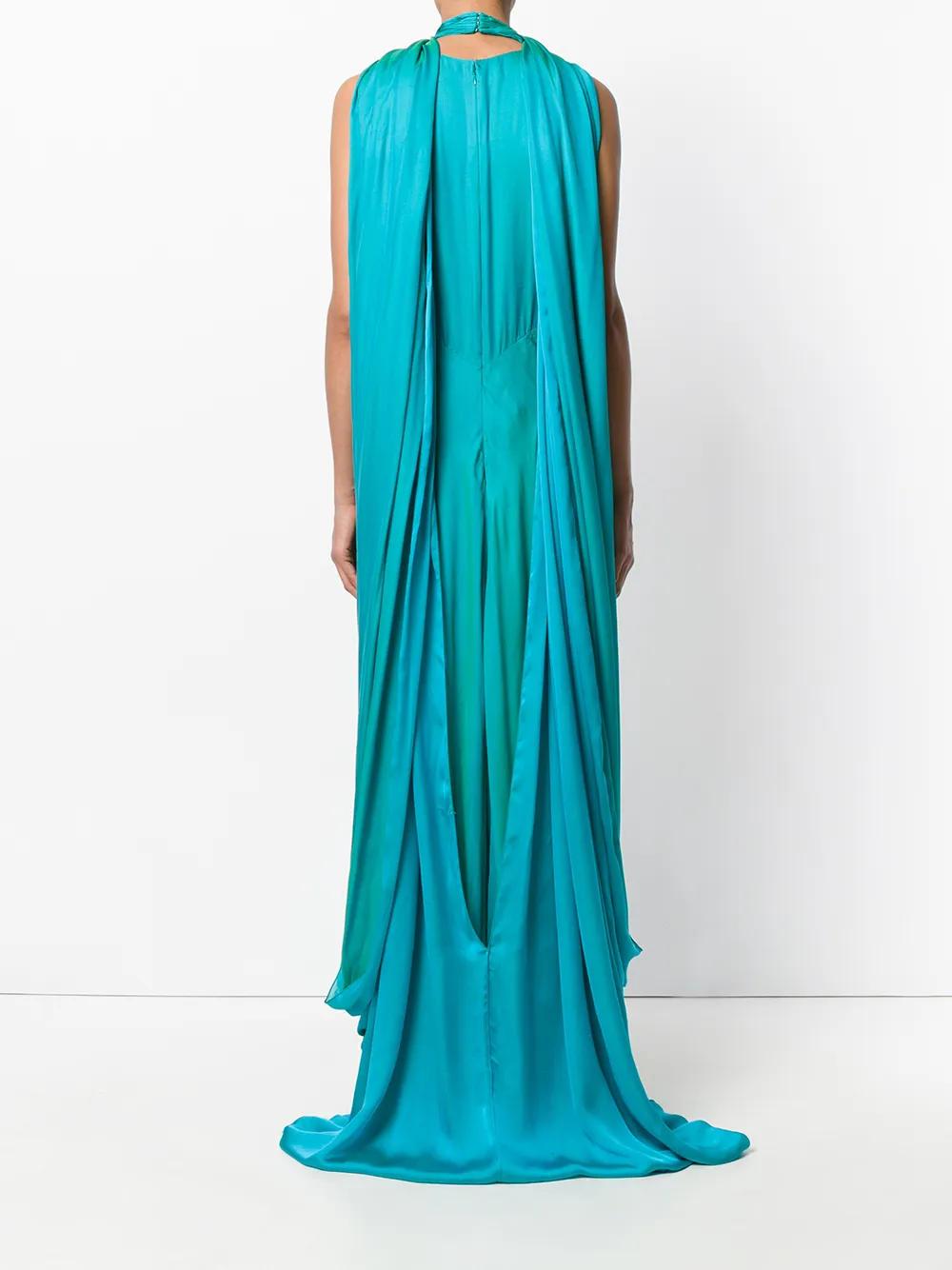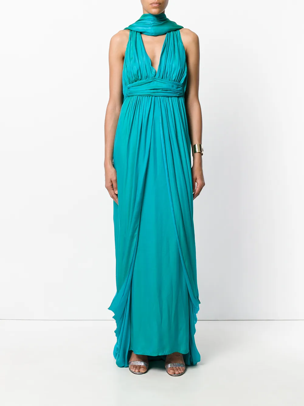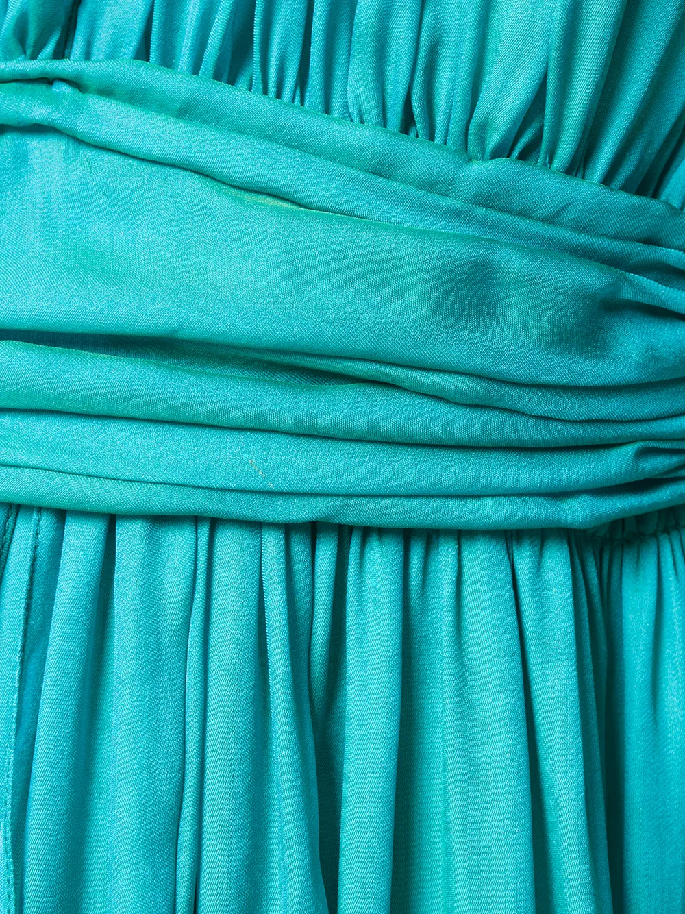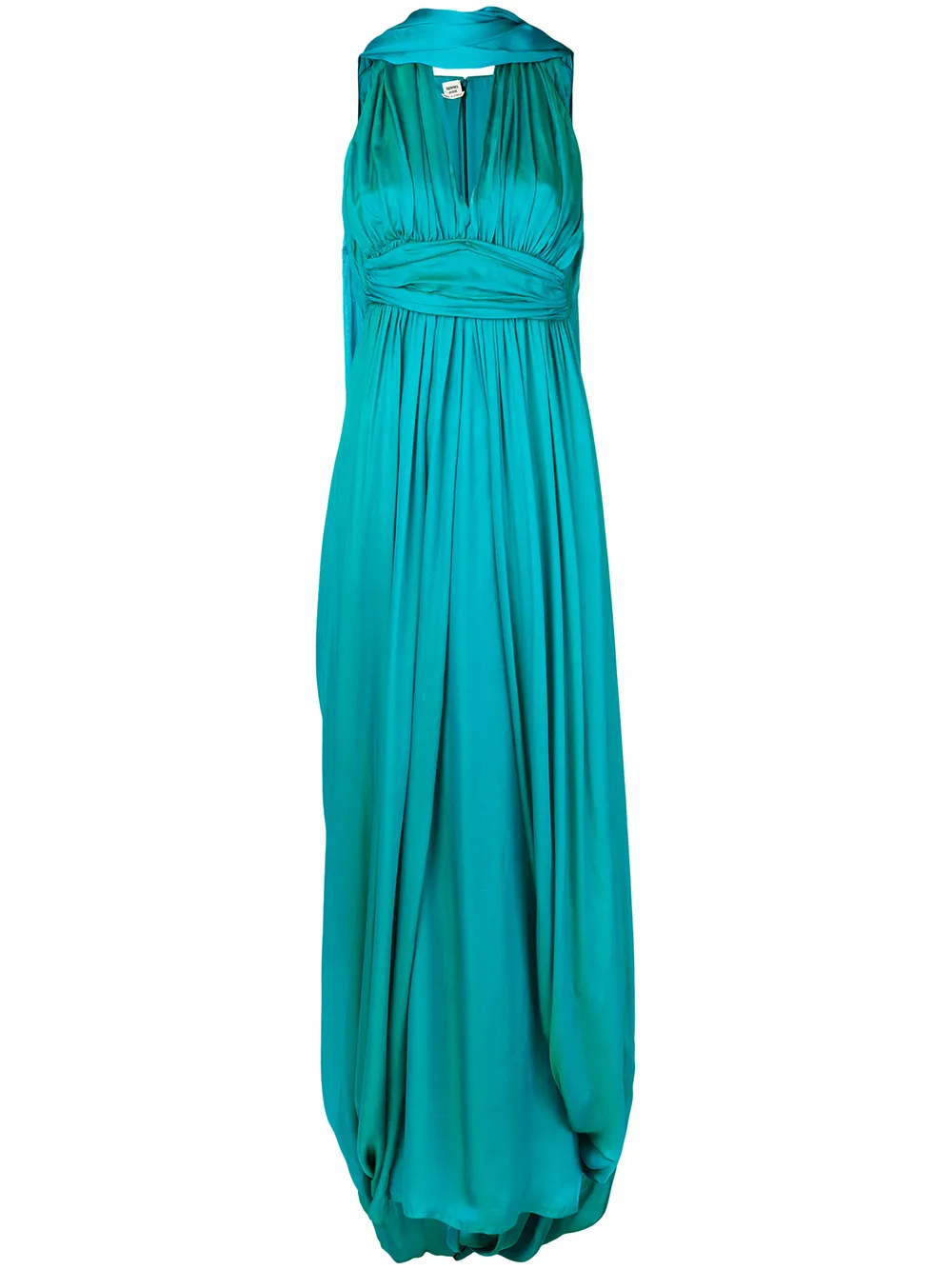 Hermès are famous for the highest quality items produced almost entirely in their French ateliers. The maison is a benchmark for luxury and creates pieces that stand the test of time and remain stylish era-to-era. This evening gown was fashioned in Hermès’ birth country, displaying all its splendour and elegance. Crafted from the purest silk in a delicate turquoise blue tone, it is the perfect call for a luxury event. This piece features a cape detail, which is a continuation of a scarf-like detail around the deep V-neck. Draped all over, its silhouette displays an empire line with no sleeves. The fastening is concealed on the back, to a long length of an asymmetric opulent skirt. Please be mindful that this piece has led a previous life, and may tell its story through minor imperfection. Purchasing this item continues its narrative, so you can be confident that you’re making a POSITIVELY CONSCIOUS choice for the planet.